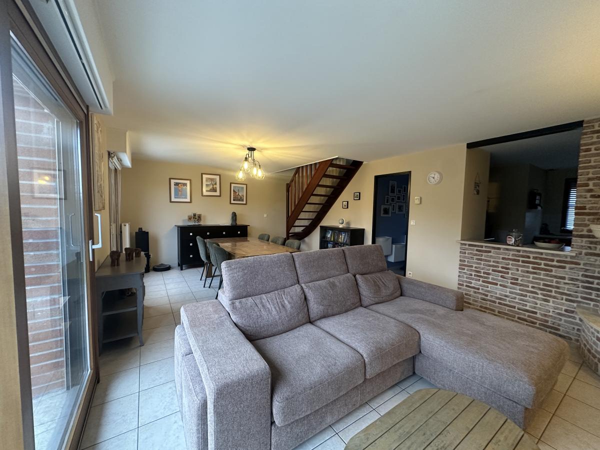 Provin, à proximité de toutes les commodités et dans un secteur calme, maison semi individuelle de 93 m² habitable environ construite dans les années 2000 sur une parcelle de terrain de 320 m² environ. Elle se compose d'un hall d'entrée, une cuisine équipée, un salon/séjour avec cheminée feu de bois avec insert, une salle de douche, un WC et une buanderie. A l'étage, un palier desservant 3 belles chambres, un bureau et un WC. A l'extérieur, un jardin clos, un abri de jardin et un stationnement de 2 à 3 véhicules. Maison en parfait état d'entretien, chauffage central au gaz, menuiseries double vitrage.